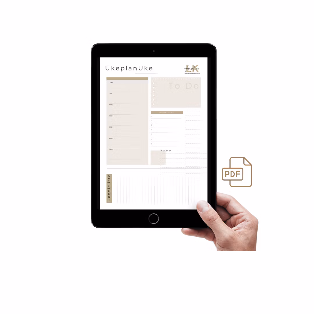 Ukeplan i størrelse A4 som du kan kjøpe, laste ned og skrive ut. Heng ukeplanen på kjøleskapet eller oppbevar de i en mappe. En praktisk handleliste nederst på arket gjør at du kan rive den av og ta med på butikken når du skal handle.